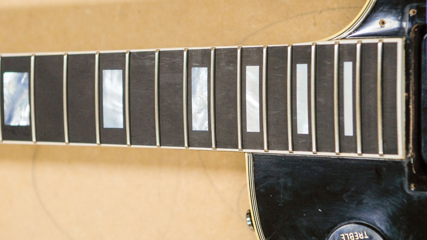 The Gibson Les Paul pictured below came to Xylem Guitars for a refret. Flatsawn ebony fretboards like the one on this guitar tend to chip out badly with fret removal (even when using a special "chip-stopper" tool and pre-heating the frets). Note the large chip-outs and finger wear on the fretboard in the first image. The fretboard was re-shaped and the chips repaired, as shown in the second image. New frets were then installed, leveled and polished, as can be seen in the third image.