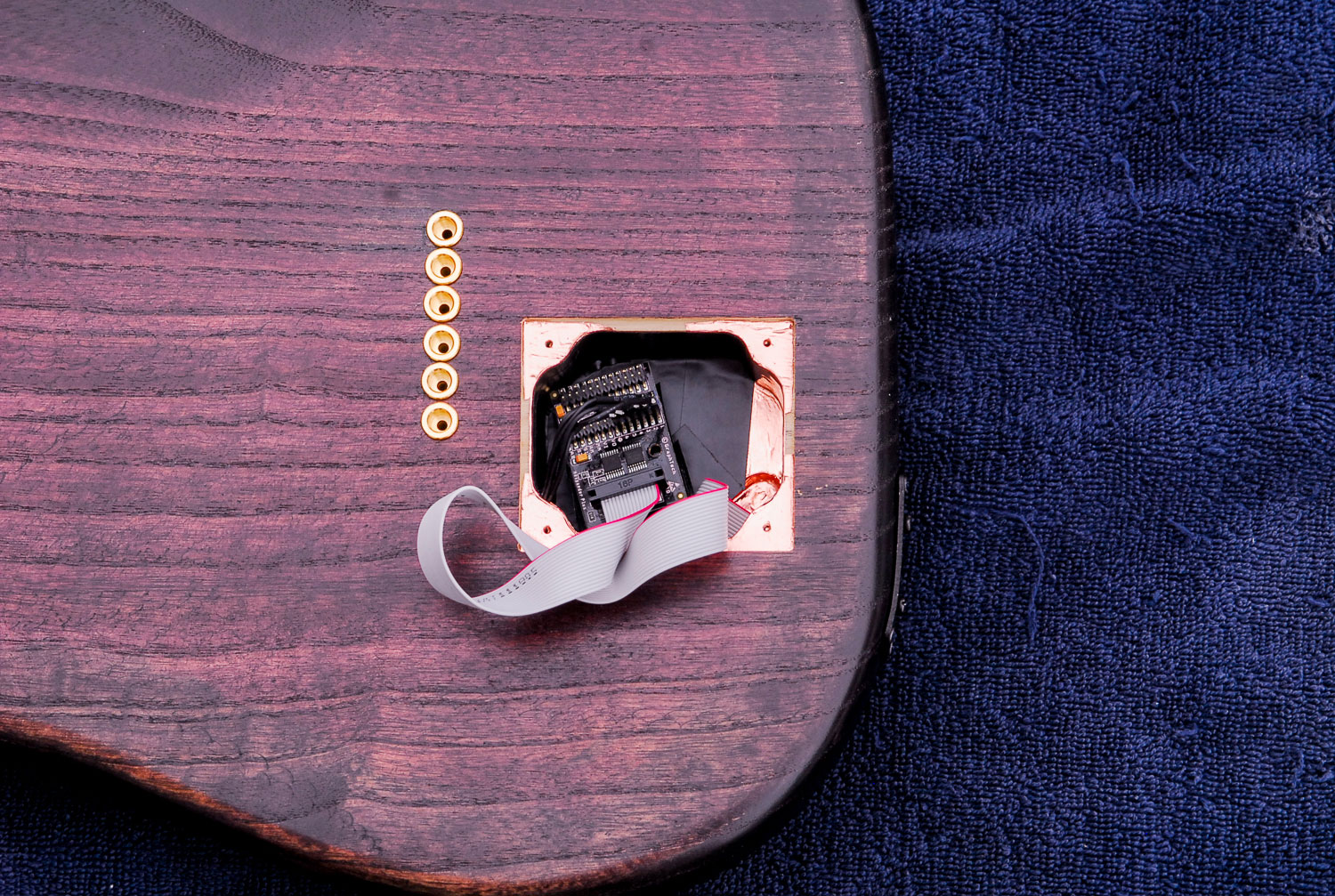 The images below illustrate a Stratocaster guitar that had a new cavity added (and shielded) to accommodate a Ghost Hexpander module.