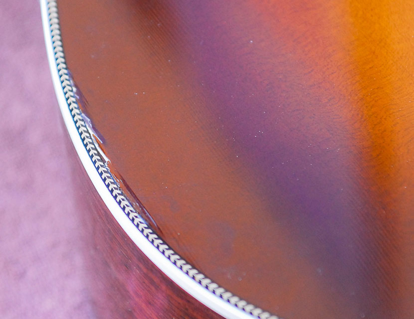 Repair of chips, cracks, dents and defects in the finish of guitars, basses and stringed instruments. Often involves color-matching bare wood exposed below the finish, and drop-filling of damage to nitro-cellulose, polyester and other hard finishes.