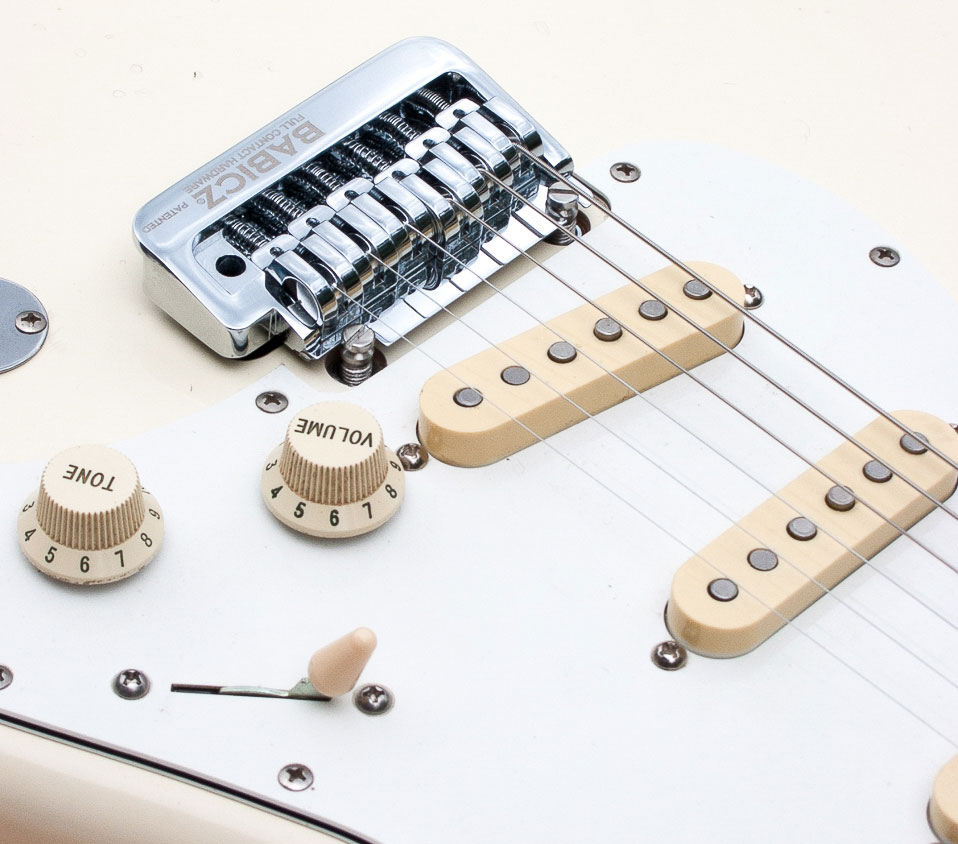 Check out the Babicz tremolo Xylem installed on this upgraded white Stratocaster!